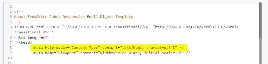 This type of error is simple to fix, however. All you need to do is ensure you have a specific meta tag at the top of your HTML email template, typically found under the <head> tag. Here’s what this looks like: