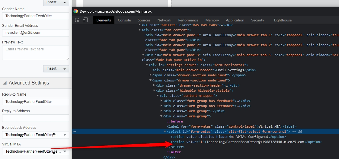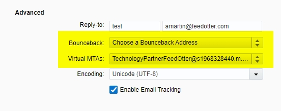FeedOtter allows you to set the Eloqua BBE (bounceback email) and VMTA (custom sending IP) settings if your Eloqua account supports these features. Please adhere to the following guidelines if you wish to use these options: